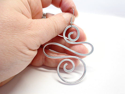Big silver aluminum spiral earrings. Aluminium dangle celtic earrings. Contemporary jewelry
