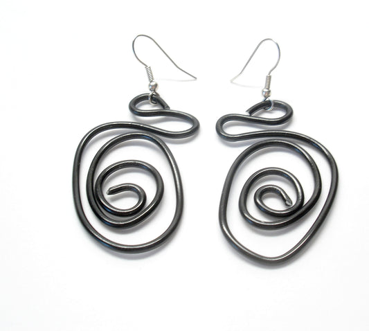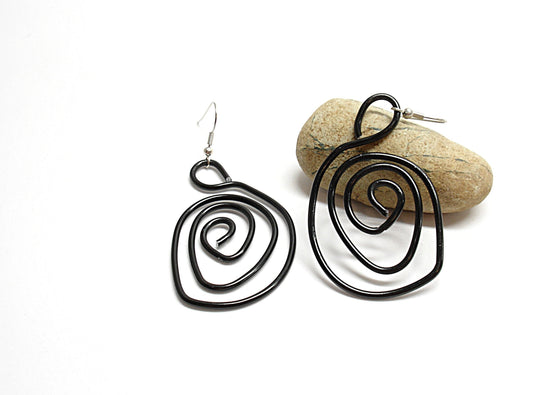 Big black dangle earrings. Modern aluminium spiral earrings. Contemporary statement aluminum jewelry.