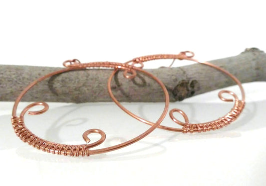 Big copper dangle earrings. Round hammered earrings with spiral. Copper jewelry