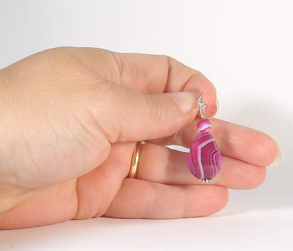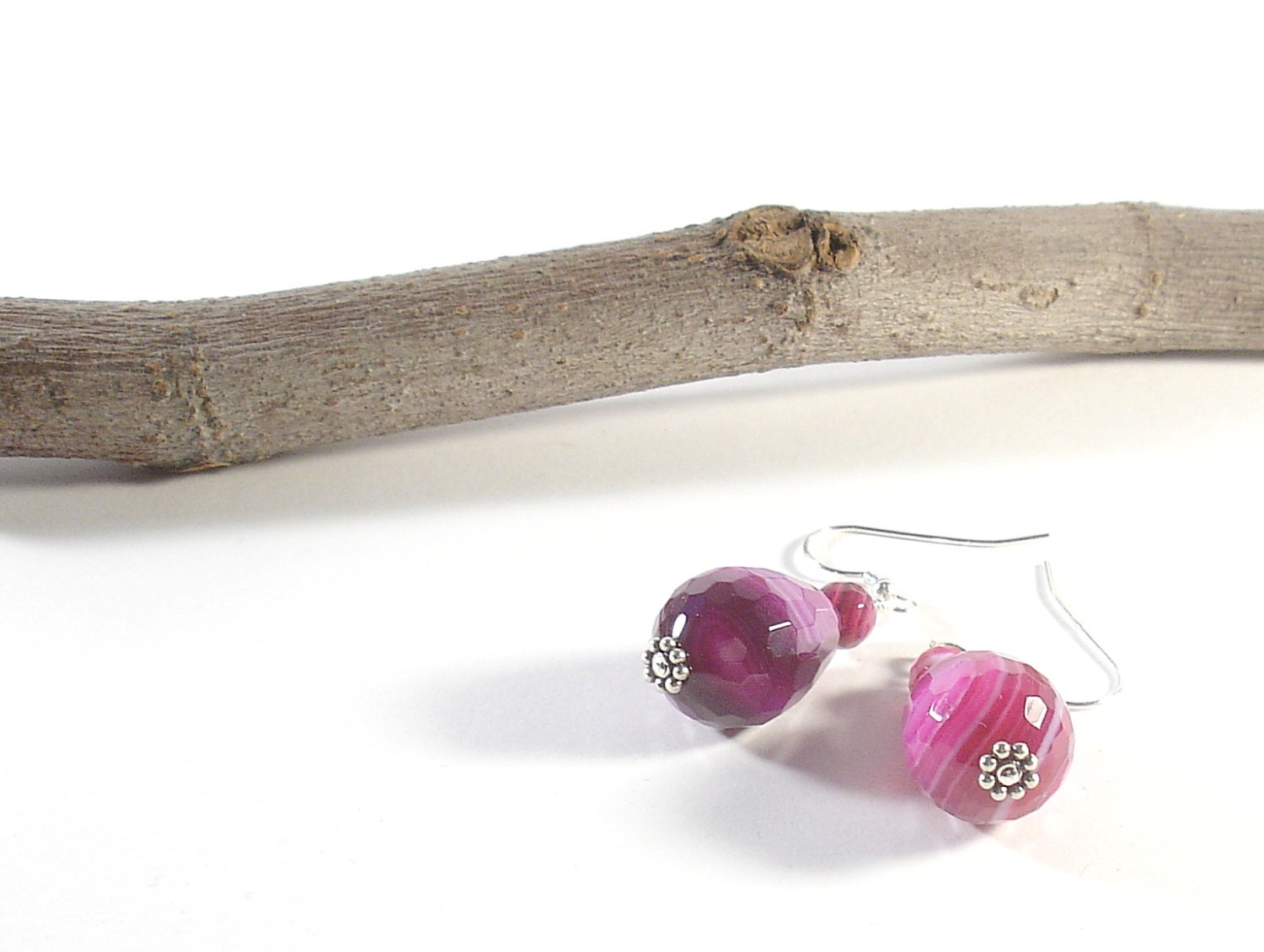 Simple and elegant earrings made with a faceted striated agate briolette and a smooth round striated agate bead. The stones are strung on a sterling silver pin and the ear-wire is also in sterling silver.