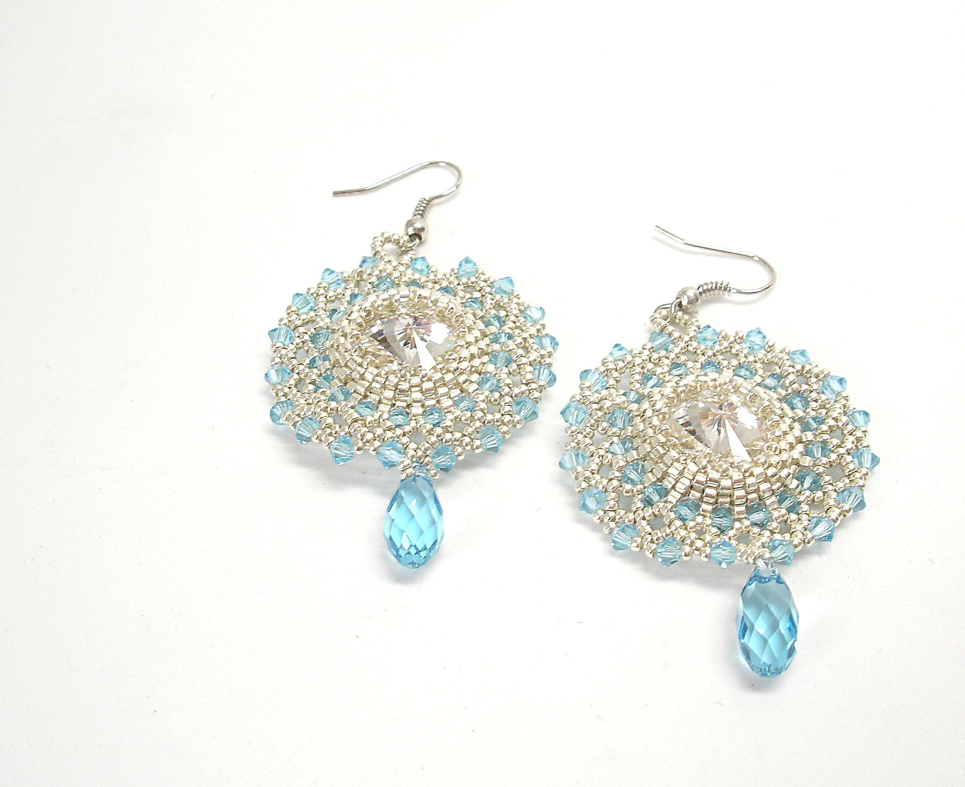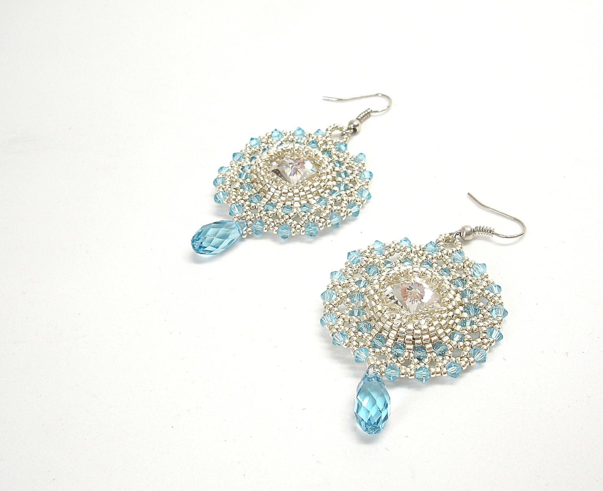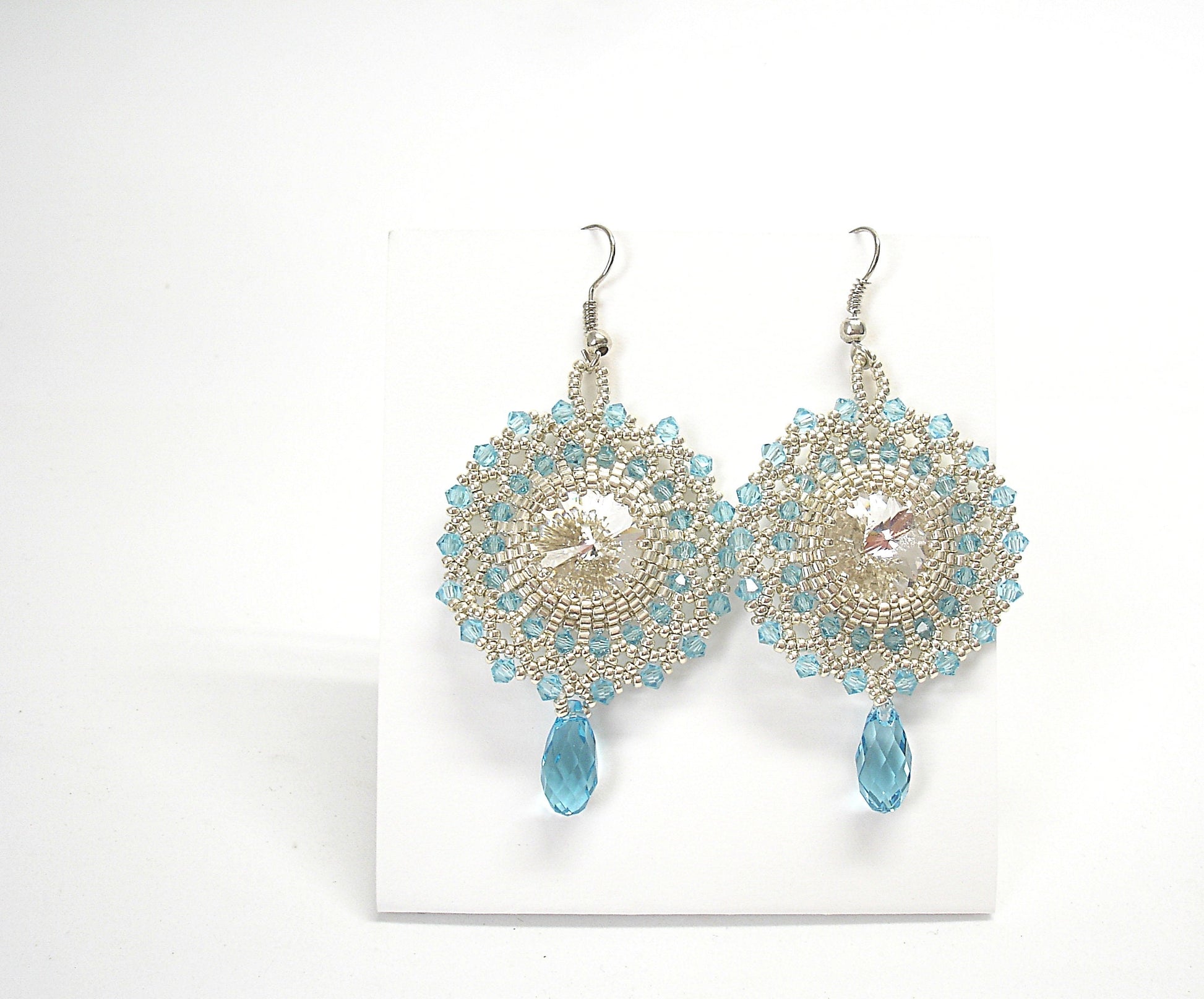 These precious dangle earrings are made with Swarovski crystal Rivoli 16 mm (aquamarine color), japanese beads, crystal drop, lightblue bicone and steel ear-wires.